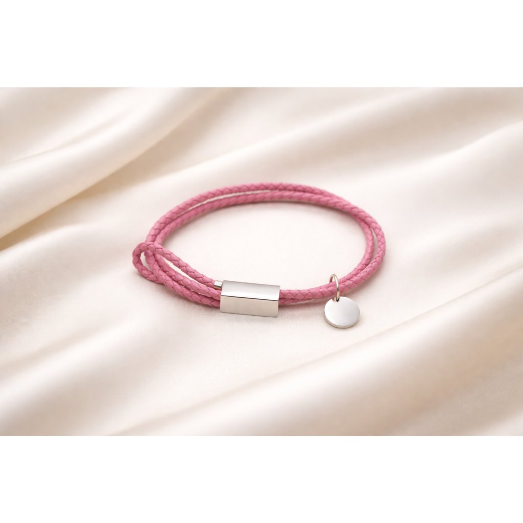 Stylový dámský náramek, kombinující pletený řemínek v růžové barvě a stříbrnou chirurgickou ocel. Úžasný dárek za skvělou cenu!