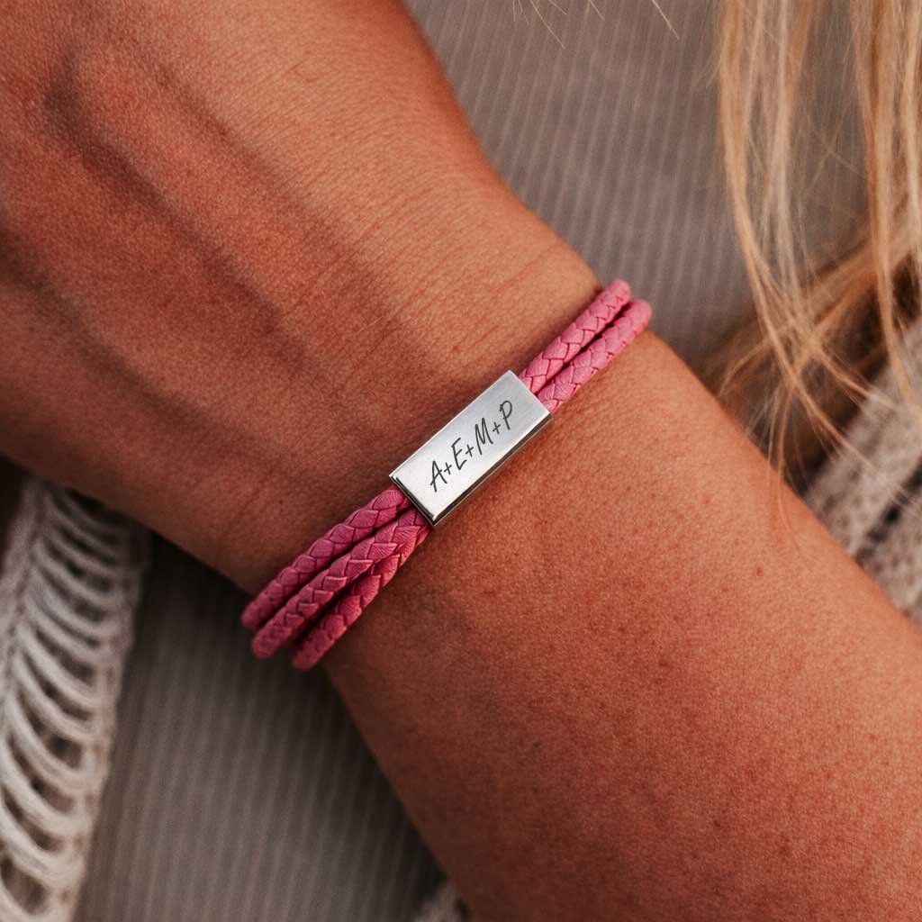 Dámský náramek s textem - Leather - Růžová/Stříbrná