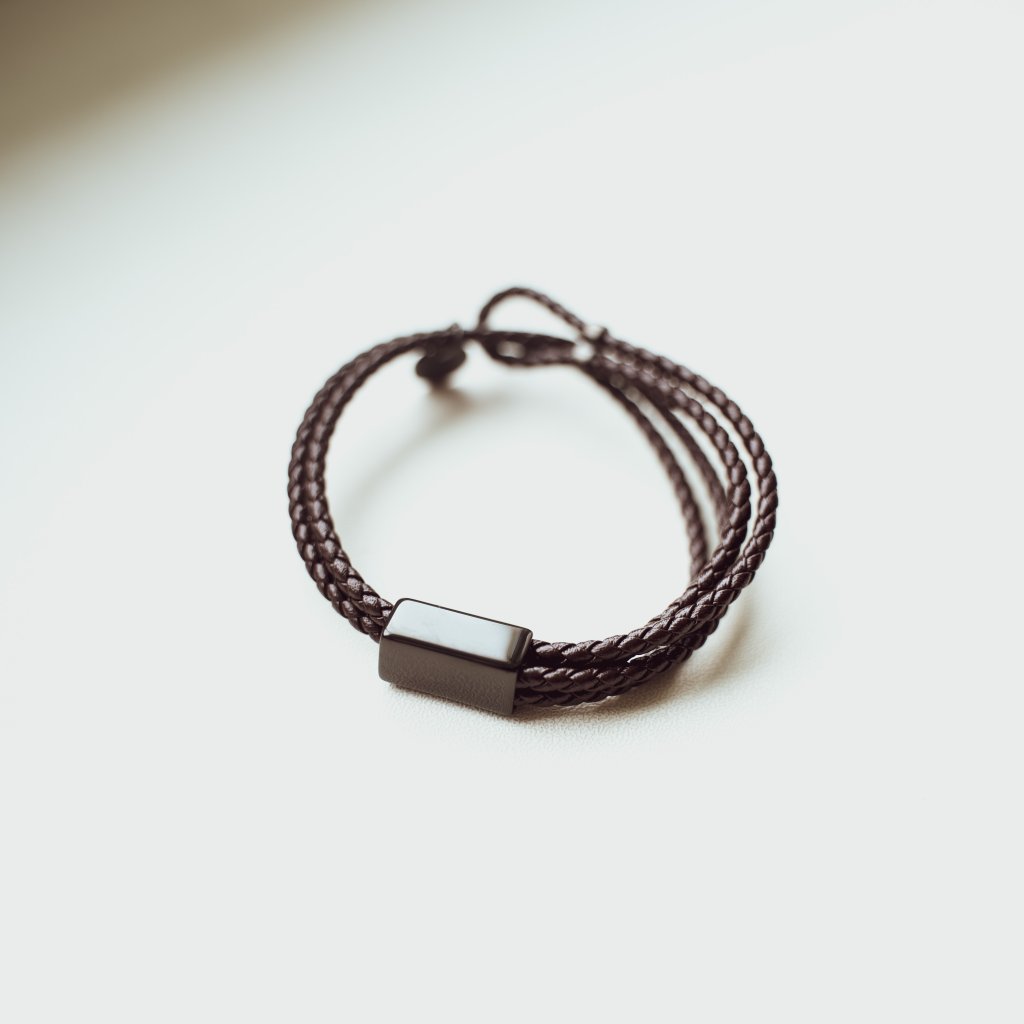 Stylový pánský náramek, kombinující pletený řemínek s koženým povrchem v tmavě hnědé barvě a černou chirurgickou ocel. Úžasný dárek za skvělou cenu!